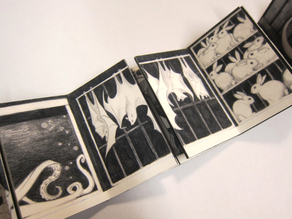 It depicts twelve pencilled illustrations of life in lockdown and twelve corresponding illustrations of a variety of animals in cages and crates. The book is made up of multiple spines, which allows the pages to be flipped easily from hand to hand.