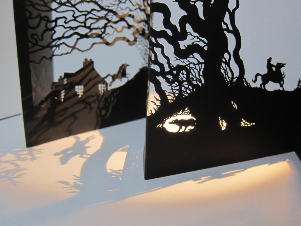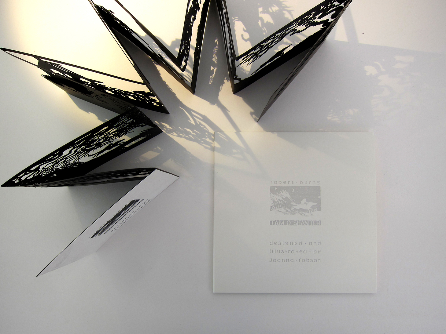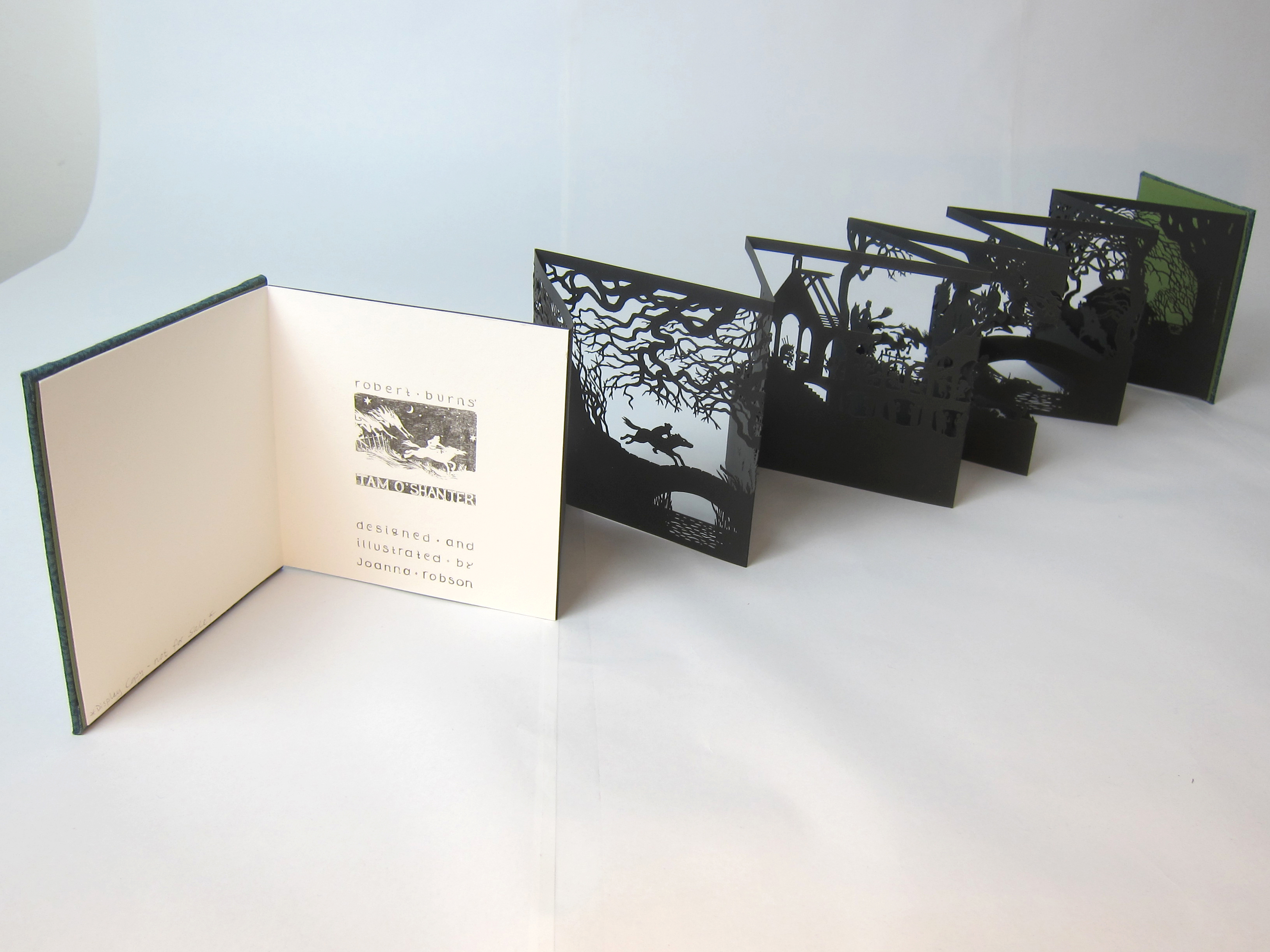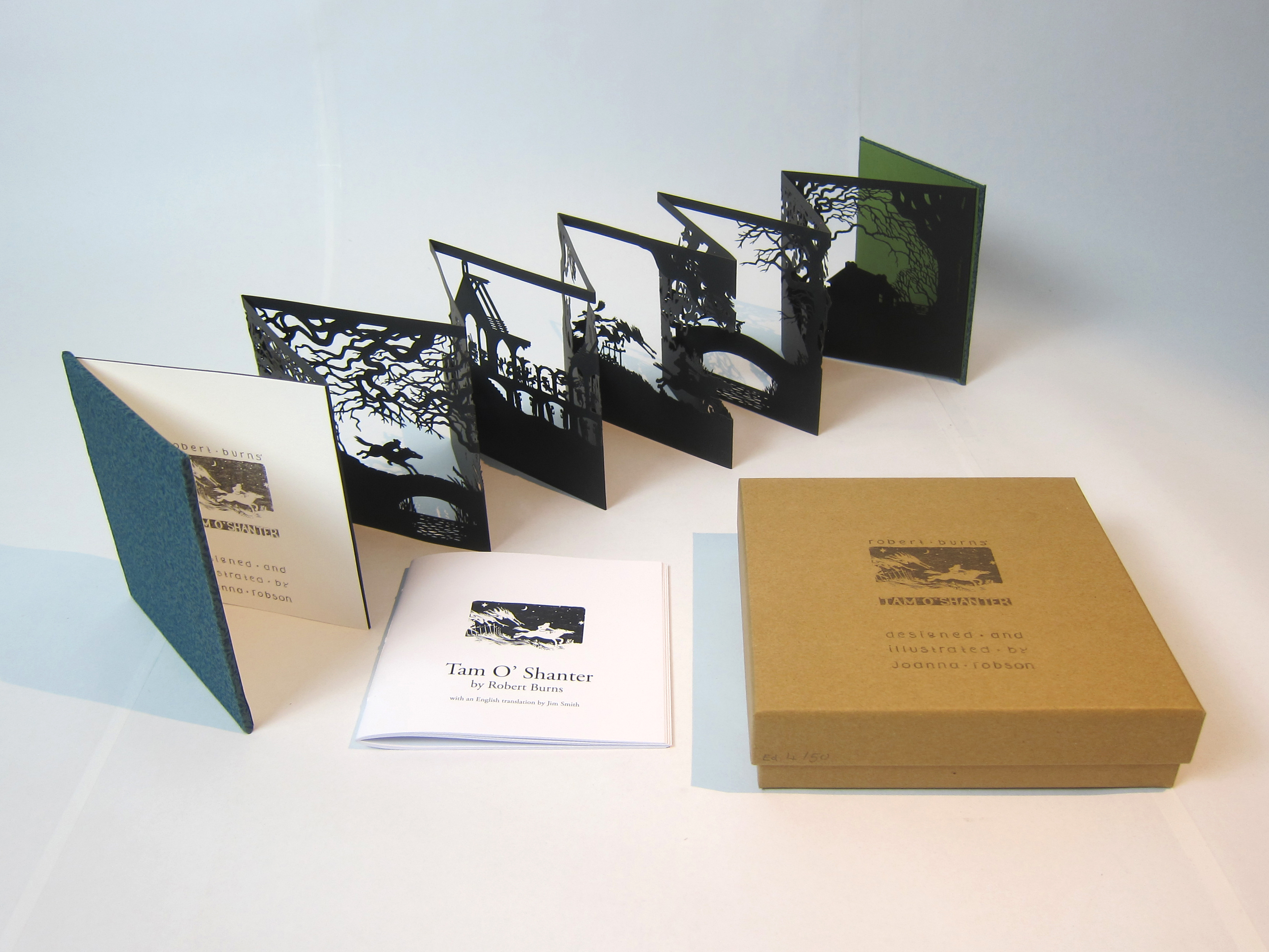 Robert Burns’ epic poem Tam O’Shanter is re-told in a wordless paper-cut leporello, which follows the misadventures of a farmer on his way home from the pub and a chance encounter with a coven of witches and warlocks on the way home.