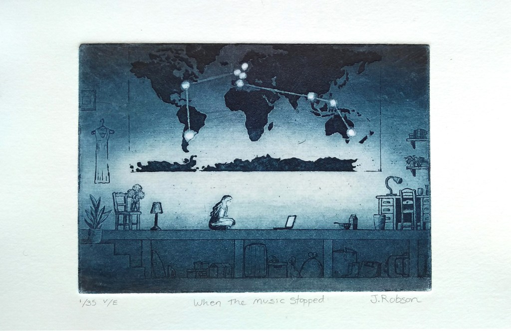 When the Music Stopped is an etching completed in 2025 that references the early days of the first lockdown in Spring 2020, where technology became the main way to maintain contact with friends and loved ones.